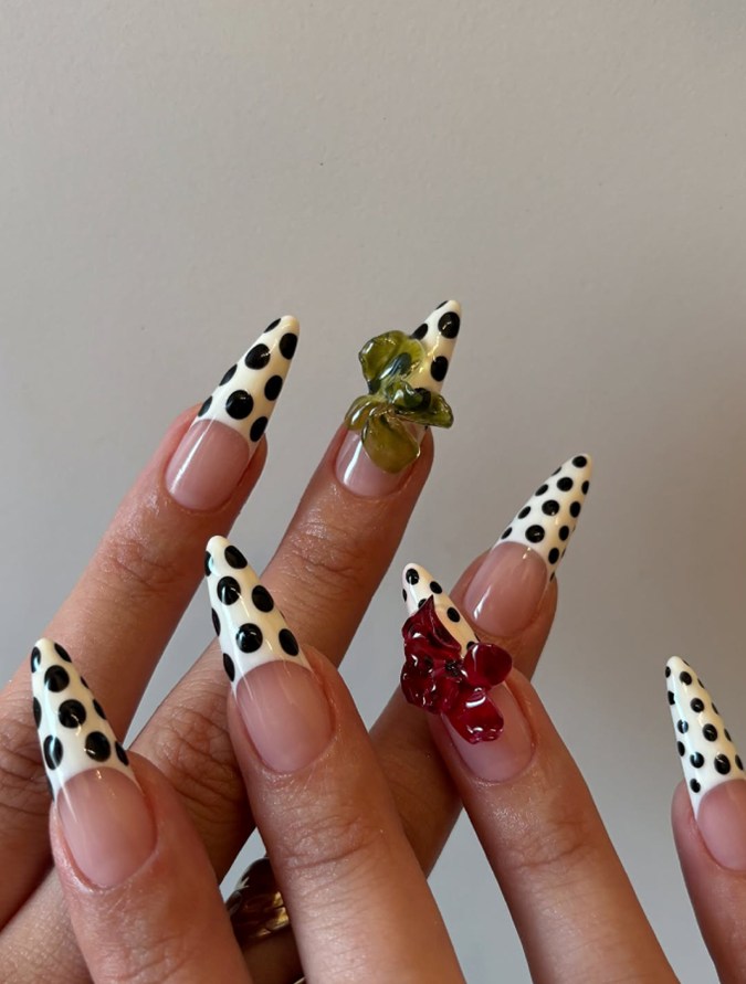 The rise of the polka dot nail trend aught to be studied — in the past year searches for the trend have increased on Pinterest by 93 per cent. Plus, celebrity nail artists like Zola Ganzorigt have started painting polka dots on their A-list clients like Hailey Bieber.