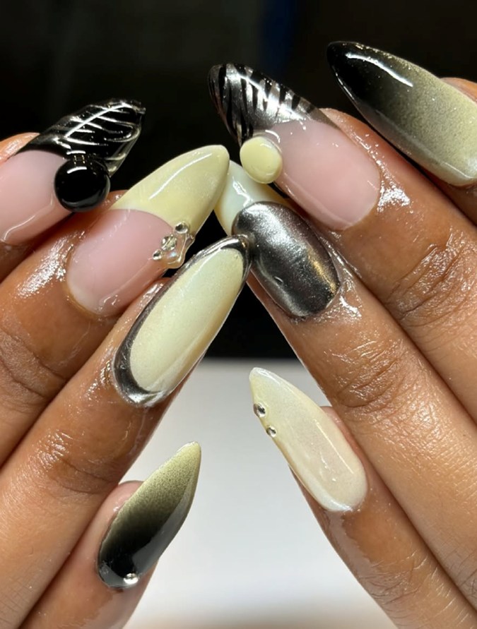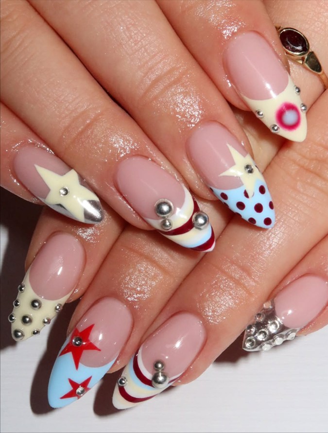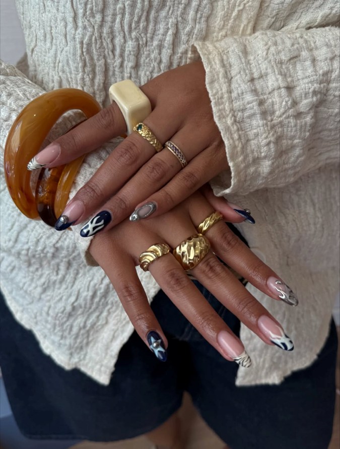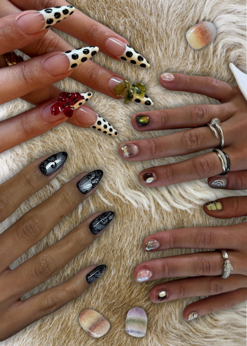 Influenced by the wardrobes of cool girls everywhere, street style nails draw inspiration from clothing patterns and textures, and incorporate 3D elements, icons and logos.