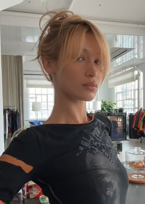 In the clip, Hadid maintains a nonchalant air as she gathers her blonde tresses into her ponytail.