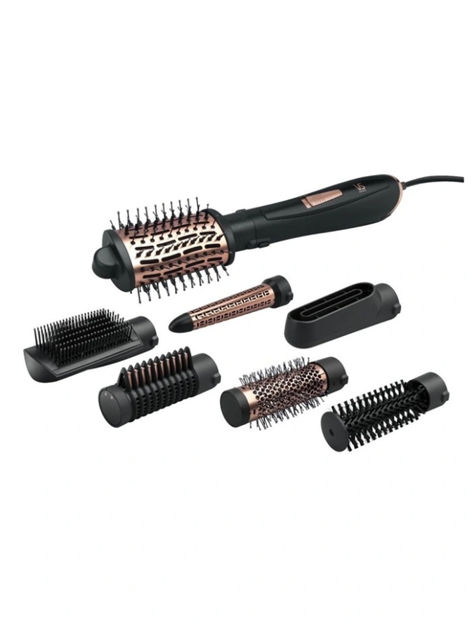 Equipped with 6 attachment heads (hair dryer nozzle, curl diffuser, paddle brush, oval brush and two curling barrels)
