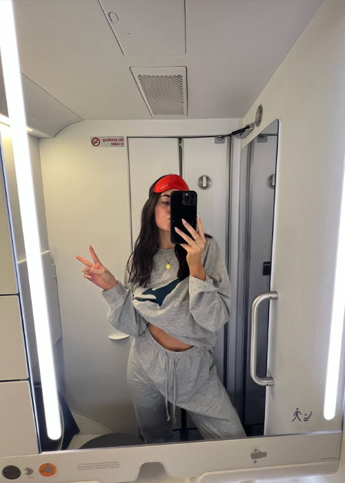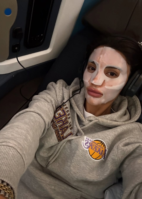 “When travelling I get extremely dehydrated. I couldn’t think of anything worse than travelling with a full face of makeup. I love putting on a sheet mask mid-flight while watching a movie. I also take my portable LED mask with me on the flight which helps de-puff my face, [and] I also take my serums with me to keep my skin as hydrated as possible.”