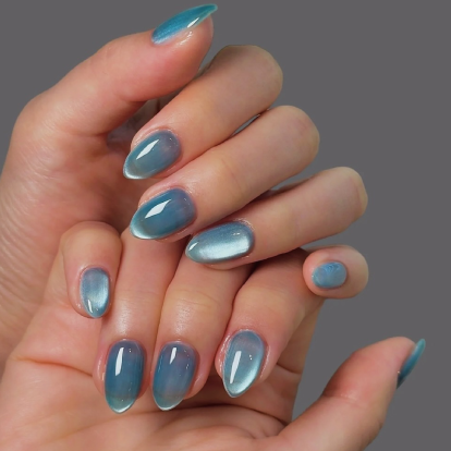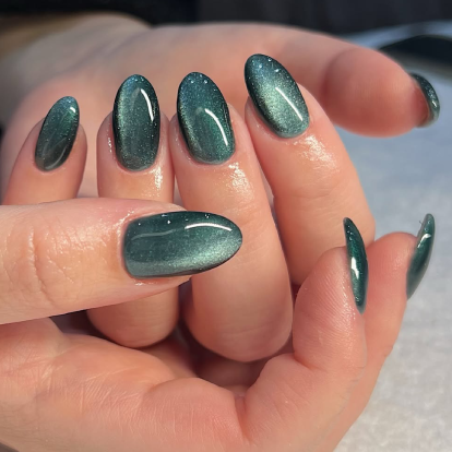 A cat eye manicure is a glossy, light-catching nail look created with magnetic polish that forms a sleek, shimmering line across the nail — just like the reflective gleam in a cat’s eye. Using a tiny magnet, the pigment is shifted to create a silky beam of light that moves as you do, giving the manicure its mesmerising, almost 3D effect. The result is a blend of shimmer, depth and dimension that instantly elevates any nail shape or colour palette.