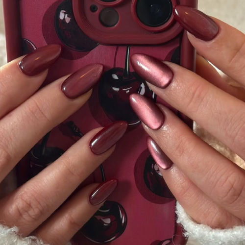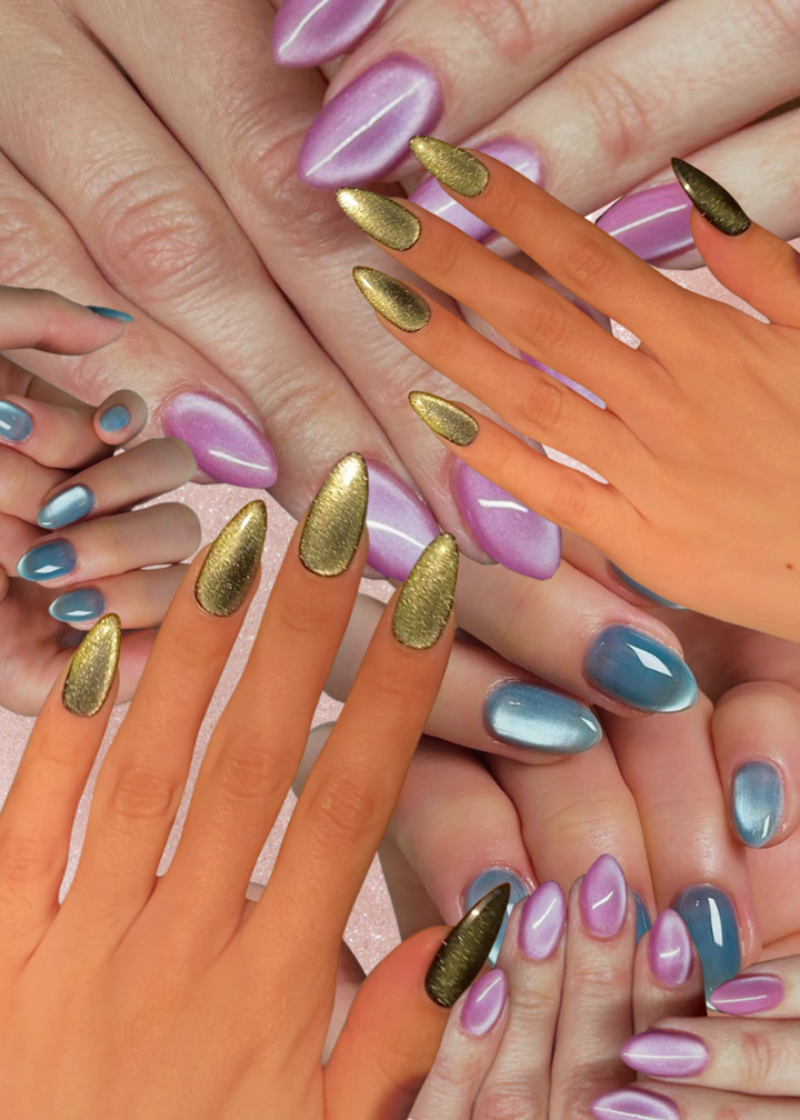 Cat eye nails tend to cost more because the look requires specialised products and extra time to perfect. Magnetic gel polishes are pricier than standard formulas, and your nail tech needs to work quickly and precisely to manipulate the shimmer with a magnet before the polish sets. Achieving a crisp, dimensional beam — or a soft, smoky glow — takes skill and a steady hand, especially if you’re layering colours for a more dramatic effect. The finish is essentially bespoke, crafted nail by nail, which adds to the service time. You’re paying for premium materials, expertise and that mesmerising, light-shifting payoff.