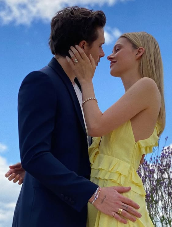 Brookylyn Beckham asked his girlfriend of nine months, Nicola Peltz, to marry him in the Cotswalds in 2020 while visiting his family. After looking back at the lavish, no-expense-spared wedding the pair had in 2022, their engagement was certainly pared back by comparison. Beckham's younger sister Harper captured the moment on camera, and Peltz's large new ring looked very flashy against the backdrop of her simple pale nude nail polish.