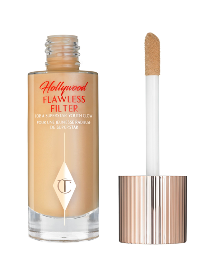 To achieve this, she recommends mixing a lightweight foundation with a radiance-enhancing primer like the viral Charlotte Tilbury Hollywood Flawless Filter ($70 from Charlotte Tilbury), which blends together smoothing airbrush polymers, moisturising glossy oils, line-blurring finely milled powders, and brightening porcelain flower extract for a poreless, flawless, radiant and youthful-looking finish.