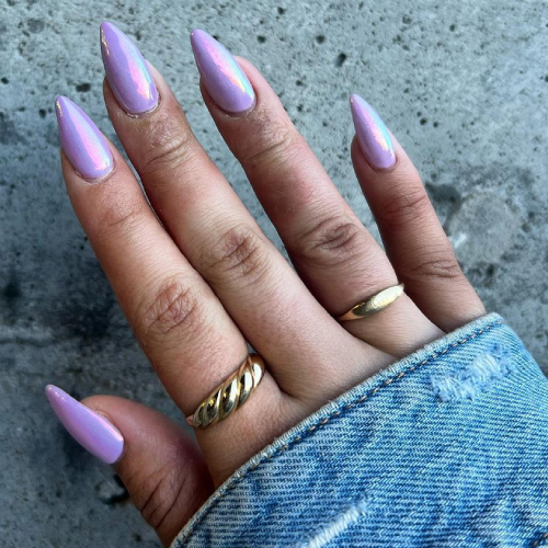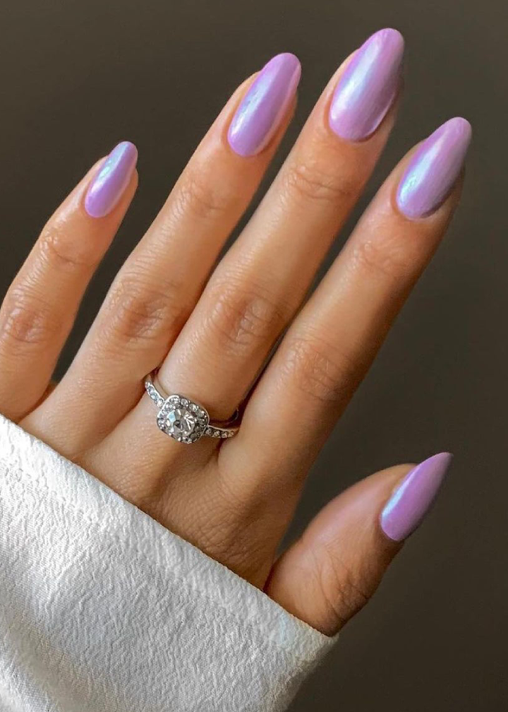 Think of the frosty lavender flip phones, computer games, and Game Boys of the early ‘00s. Pearlescent lilac polish is bringing the looks those old-school gadgets made iconic right back into the 'cool' column, and we’re beyond on board.