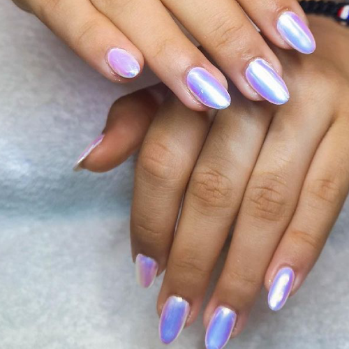 A picture is always your best bet for showing your nail technician exactly what you want, but here's the general gist. Ask for icy lavender polish with a touch of shimmer within, to then be topped with the same chrome dust that Hailey Bieber's OG look featured, just in a dreamy purple hue instead.