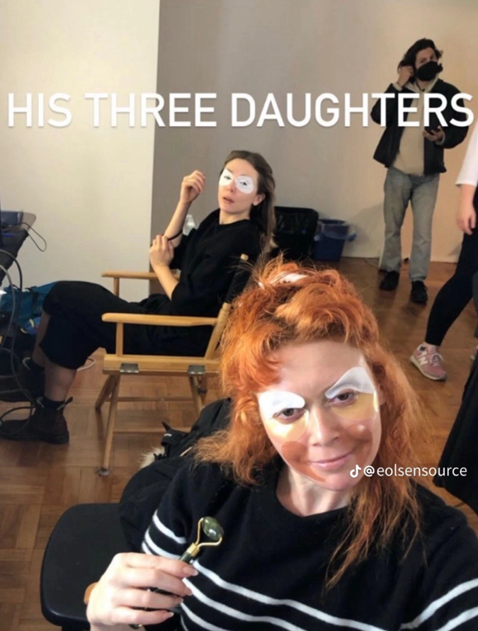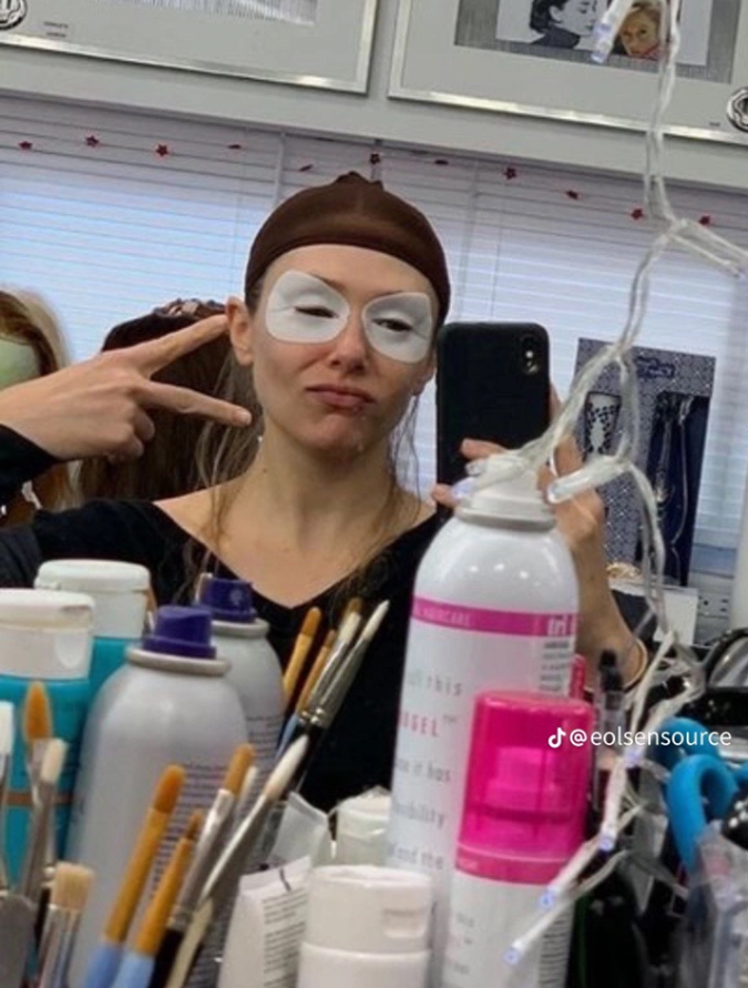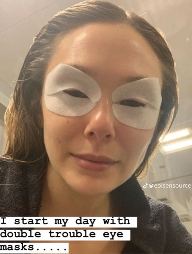 Case in point? Whilst working on His Three Daughters, Olsen combatted the effects of an early call time with a few sets of eye patches strategically placed underneath her eyes and on her upper eyelid. We're talking a 360 degree approach to tired eyes, dark circles and puffiness, people. Olsen calls them her "double trouble eye masks" — it's genius.