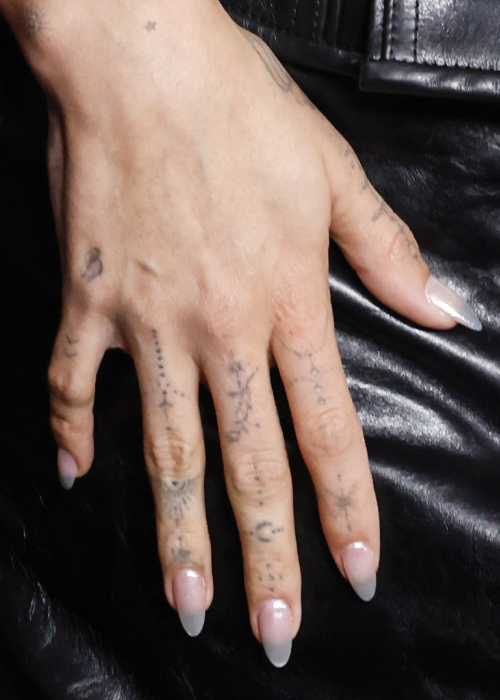 There’s less opacity to them too: picture a frosted glass door. You can slightly see through it, but it’s not exactly clear. You can see where Bieber’s fingers end and her nails go on, almost creating a French manicure effect under some lights. So yes, basically you’re getting two manicures for the price of one.