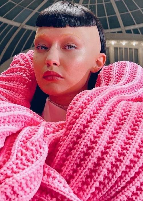 While the bowl shape is definitely present up top, the cut also has a bit of a mullet vibe (with long, straight strands stemming down at the back), and (in perhaps the wildest part) completely shaved sides.
