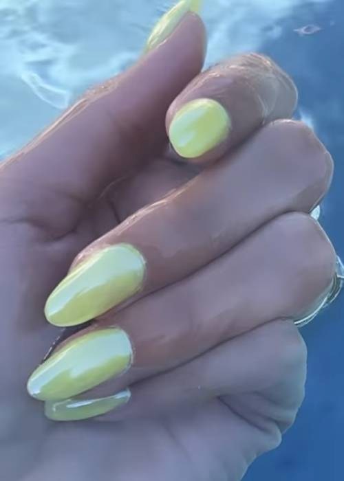 But while these polished pearlescent neutral nails are no doubt Bieber's signature, she does occasionally switch things up, as evidenced by this majestic neon yellow manicure.