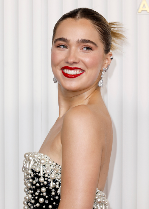 In true Gen Z style, Richardson paired her bold lip moment with an effortless cloud skin glow and a slicked back Y2K-esque bun. And those fluffy brows? An ode to Portia (for the record, we’d kill for brows like that).
