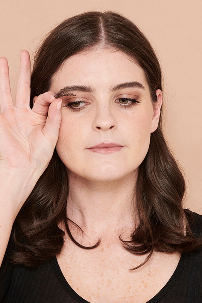 First up, you’ll need a set of falsies. We used Ardell Faux Mink Wispies in Black. You’ll also need some lash glue to hold the whole shebang together, like Duo Striplash Adhesive Dark. For ease of application, we had a pair of tweezers on-hand (Modelrock False Eyelash Applicator). We also brought in a liquid liner (Maybelline New York Tattoo Studio Liquid Ink Liner) and a volumising mascara (we used Covergirl Exhibitionist Uncensored Mascara), as well as a pair of eyelash curlers (Sportsgirl Beauty Fake It Till You Make It Eyelash Curler did the trick).