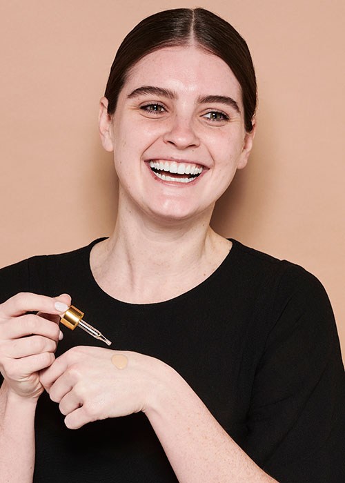 Put a pump and a half of foundation onto the back of your hand and mix it with a few drops of facial oil.
