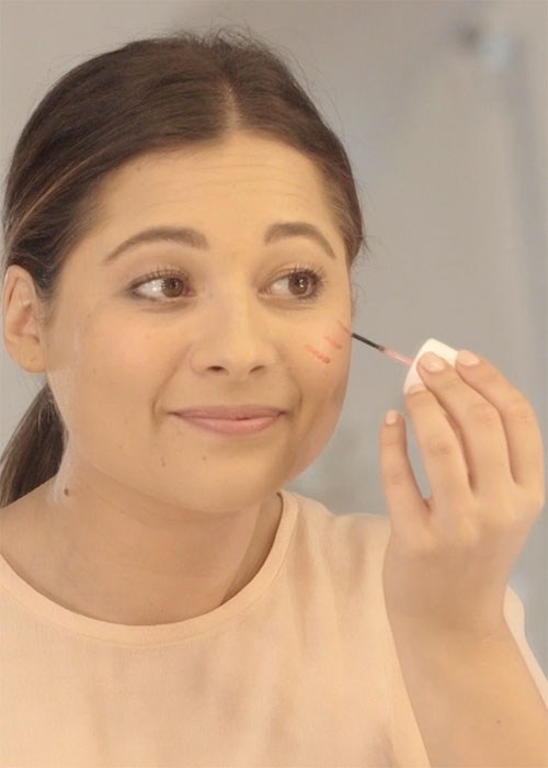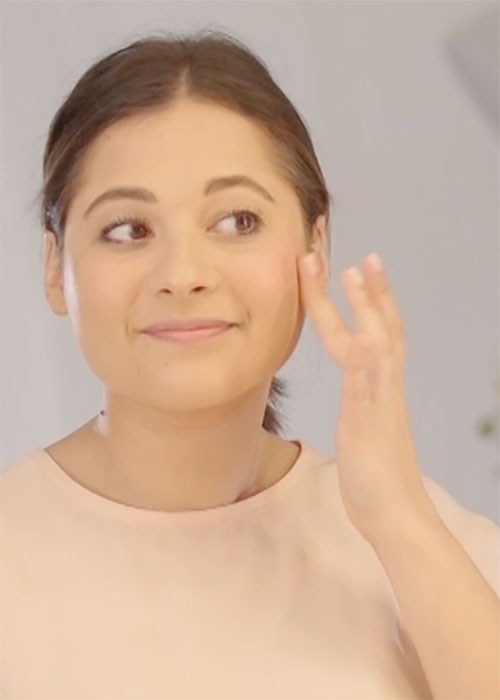 Using the brush or sponge applicator, draw three light strokes on the apples of your cheeks, and then very quickly, use your fingertips to blend the colour in and up towards your temples before the product dries.