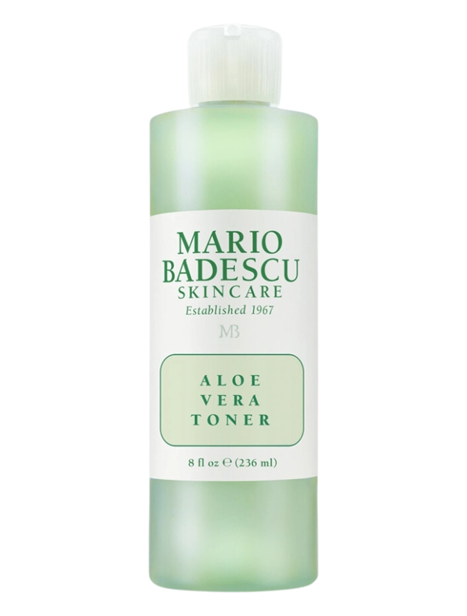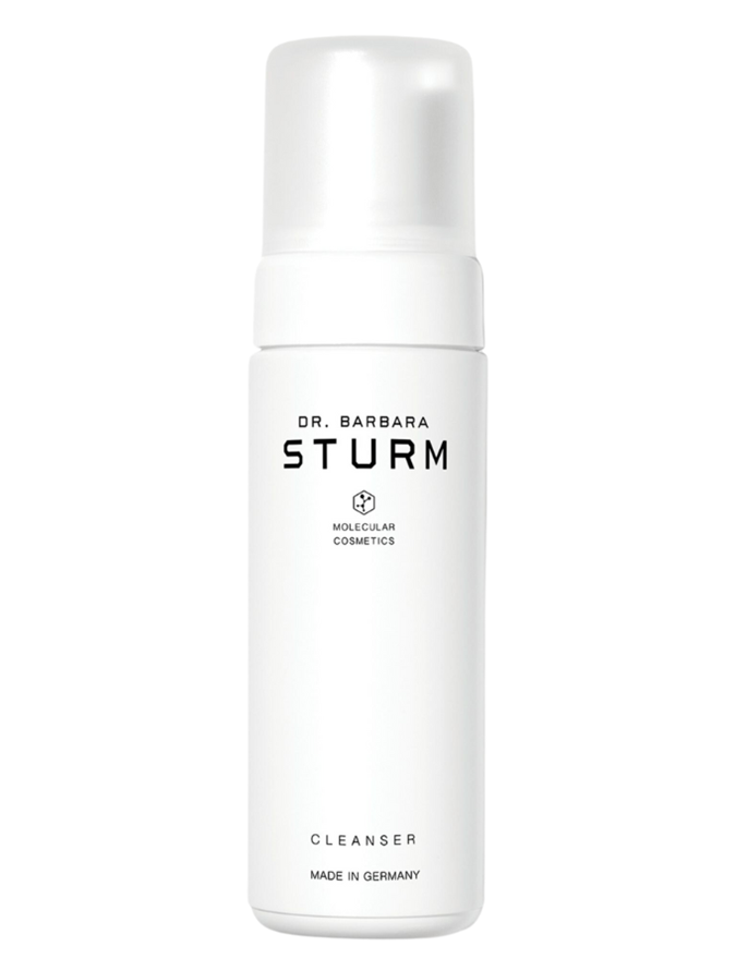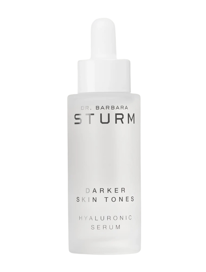 First, she cleanses her skin with the Dr. Barbara Sturm Cleanser ($99 from Cult Beauty), then she balances her complexion with the Mario Badescu Aloe Vera Toner ($27 from MECCA) and applies her first serum — Dr. Sturm For Darker Skin Tones Hyaluronic Serum ($493 from Net-A-Porter).