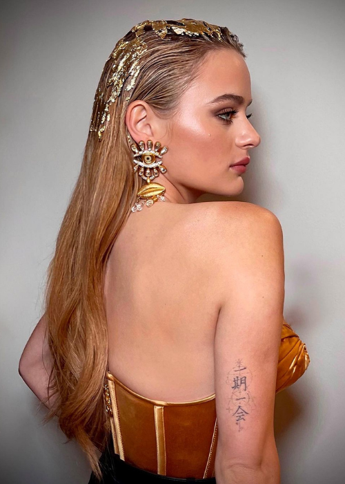 Just about every celebrity in Hollywood was in attendance, including Joey King, who arrived in a gold Schiaparelli corset and earrings, and a slicked back hairstyle gilded in liquified gold leaf. The effect was breathtaking.