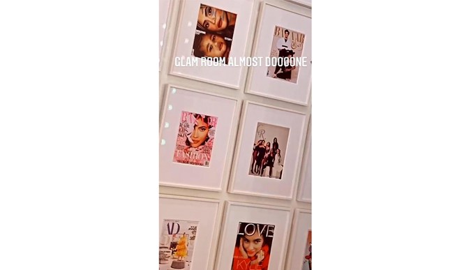 Of course, one wall was adorned with rows upon rows of her personal magazine cover appearances (relatable, right?), a feature she said she copied from sister Kim Kardashian after spying a similar mag display in her glam room.