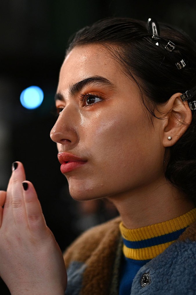 The combination of muted brown lipstick and the touch of gold metallic hues on the inner corners adds texture and depth to the overall makeup look. As for the brows, models just wore a swipe of MAC Cosmetics Brow Set to keep them in place.