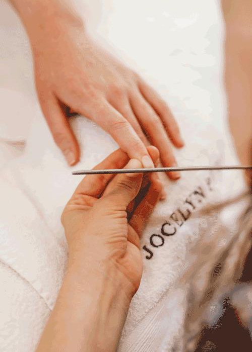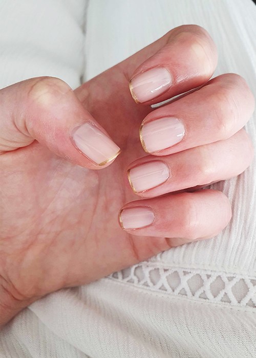 Start by filing your nails into a short, rounded square shape. “The micro French suits a shorter nail length, shaped to compliment your finger and nail plate,” advises Petroni. “The shorter the nail length, the finer the micro French becomes to keep the look elegant and sophisticated.”