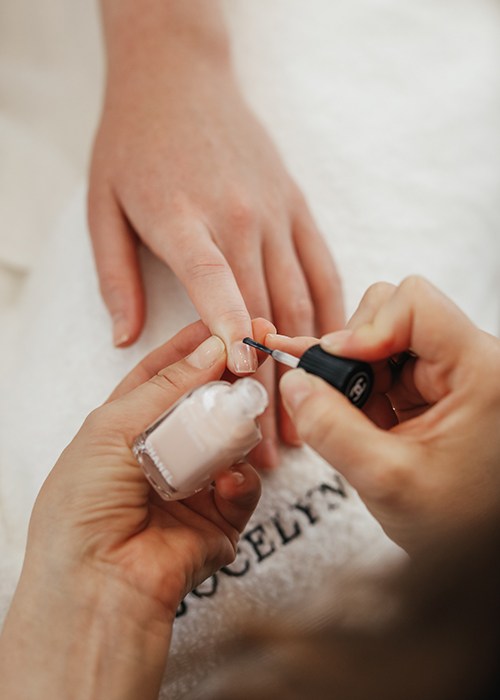Using the Chanel Le Vernis 167 Ballerina, apply two coats of colour. Petroni says this is the ideal amount to create a smooth and even finish, where brush strokes and imperfections are less visible. “Once you have painted all 10 fingers with the first coat of colour you can immediately start painting the second coat on all 10 fingers.”