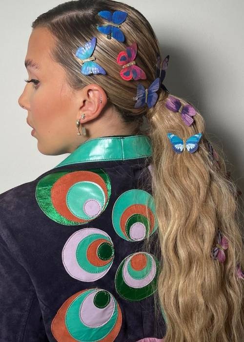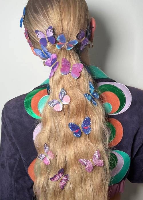 Said style? The new and improved butterfly-tail, of course! Showcasing an array of multicoloured butterfly decals cascading down a beach-waved pony, the look is basically the ethereal updo version of a mullet: business in the front and party (AKA butterflies) in the back.