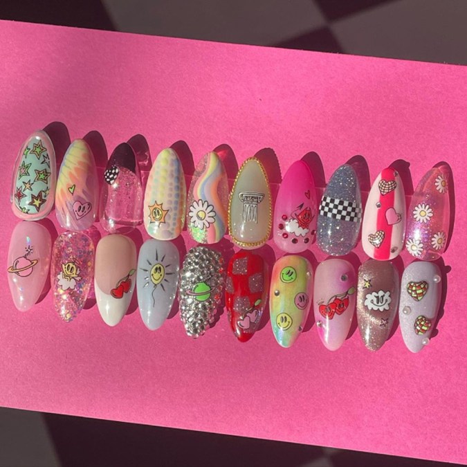 Sass Nail Artistry, on the other hand, loves that nail stickers offer “a more budget-friendly and efficient option for clients who wanna be fun but don’t have the budget or time for hand-painted art.” Adding that they’ve seen “some awesome brands come out with super cute and trendy stickers,” too.