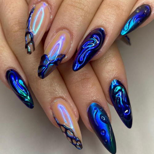 Just like a siren, you too have a way of keeping people within your grasp. But that’s all a facade, because underneath that protective outer shell is a sensitive and nurturing soul. Mermaidcore nails are the perfect way to put your best (and worst) traits on display. The oceanic hues and mirrored accents of mermaidcore are both breathtaking and moody (can relate), and the perfect way to express your imaginative side.