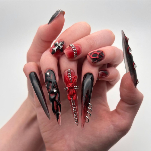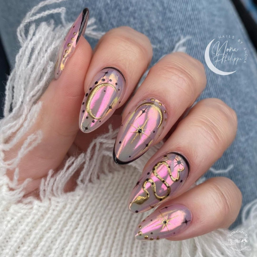 Fiesty and mysterious, Scorpios are represented by the scorpion for a reason. And the first thing we think of for the perfect Scorpio manicure? Goth glam nails. This grungy Y2K-inspired trend oozes the ‘cool without trying’ facade you’ve mastered so well. But we know this dark and mysterious persona is just a ruse, Scorpio. Just like Wednesday Addams, your soft side will be revealed eventually…