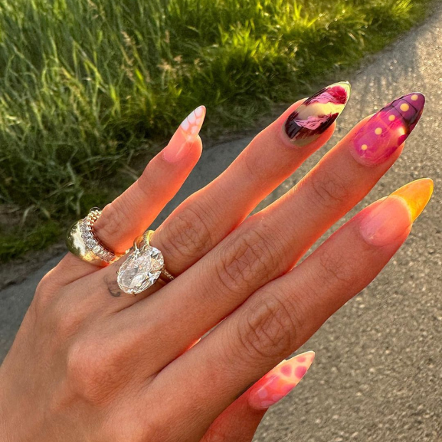 Aura nails for spring? Groundbreaking (no, truly). Because who doesn’t love a statement mix of vibrant pinks, blues and greens to ring in the new season? Keep it soft and low-key with watercolour pastels, or go big and bold with black or diamond aura nails.