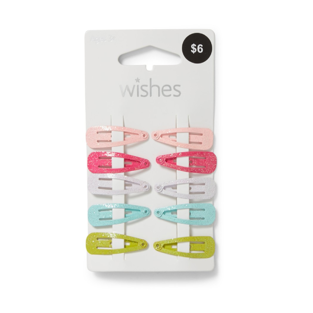 Give flowers a go with the Seed Glitter Daisy Snap Clips ($7.95 at Seed), get glittery with the Wishes Kids Glitter Snap Clips ($6 at Big W), or opt for brights with the ASOS Design Multi Snap Clips ($12 at ASOS).