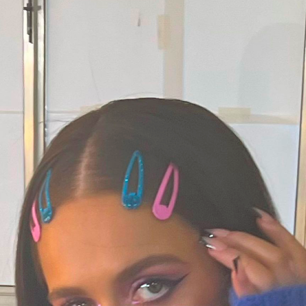 McRae went slightly more subtle (if you can call it that) placing only two clips per side rather than going for Rodrigo's triple whammy. She also opted for symmetry, with one metallic blue clip and one matte pink one per side.