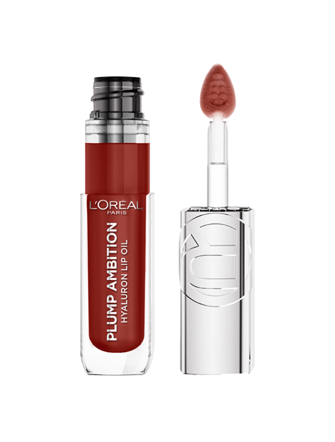 She then dabs a small amount of L'Oréal Paris' Plump Ambition Hyaluron Lip Oil in 'Wine O' Clock' ($20.99 from Chemist Warehouse) right in the centre of her lips and nowhere else — or else.
