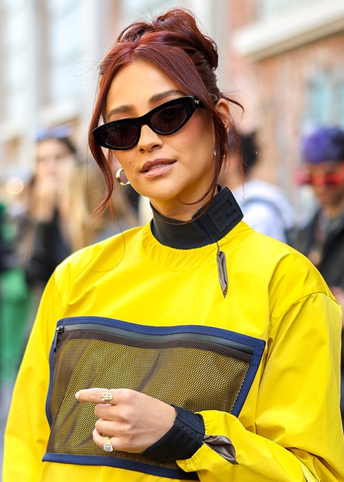 First spotted in a neon yellow outfit at Fendi, her hair was piled high in an updo with face-framing tendrils hanging loose. Celebrity hairstylist Ricky Mota was responsible for the style, using Unite Hair’s 7SECONDS Glossing Spray ($39.90 at salonwarehouse.com.au) to really amp up the shine.