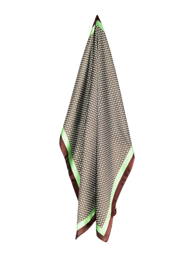 "Scarves can be styled as a chic hair accessory wrapped around a ponytail, braid, or worn as a headband, and tied around the neck as a light accent, or knotted onto a handbag for a splash of pattern," Adolphe instructs.