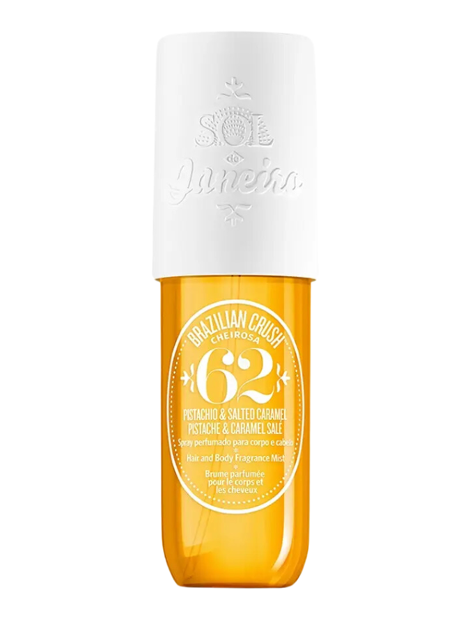 Sol de Janeiro Brazilian Crush Cheirosa 62 Perfume Mist opens with top notes of pistachio and almond to a heart of heliotrope and jasmine petals, while the dry down reveals a blend of vanilla, salted caramel and sandalwood.