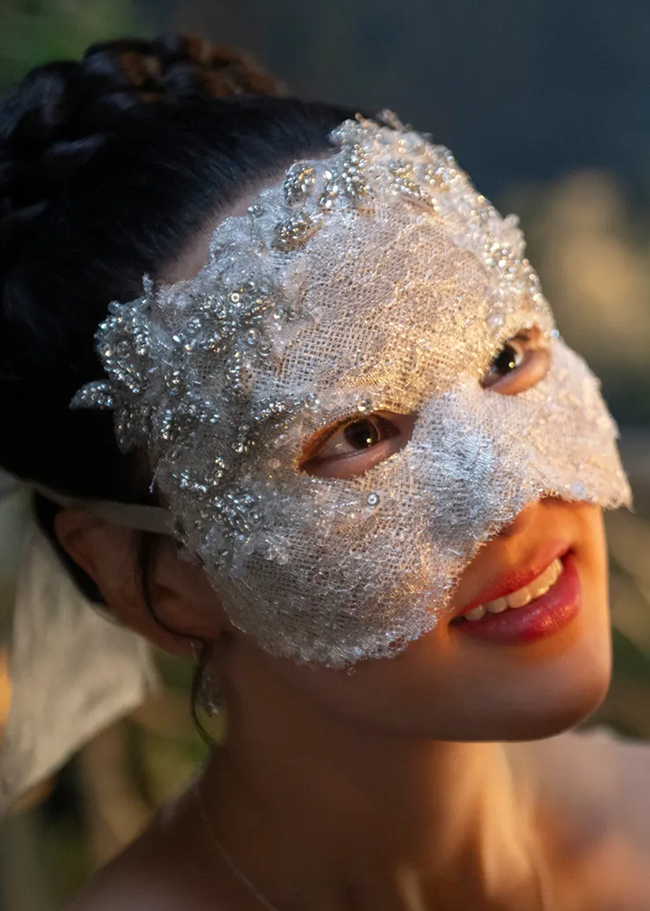 “Obviously, you lose the eyes behind a mask, so we had to think about how you’re still going to have the light reflecting through the eyes,” Collins shared. “Even just putting the little rose to the balm on her lips. Yerin’s got such beautiful lips. Just that little bit of makeup that pops, the flush of the cheek. We really focused on the lips so that they really popped out with this sparking mask.”