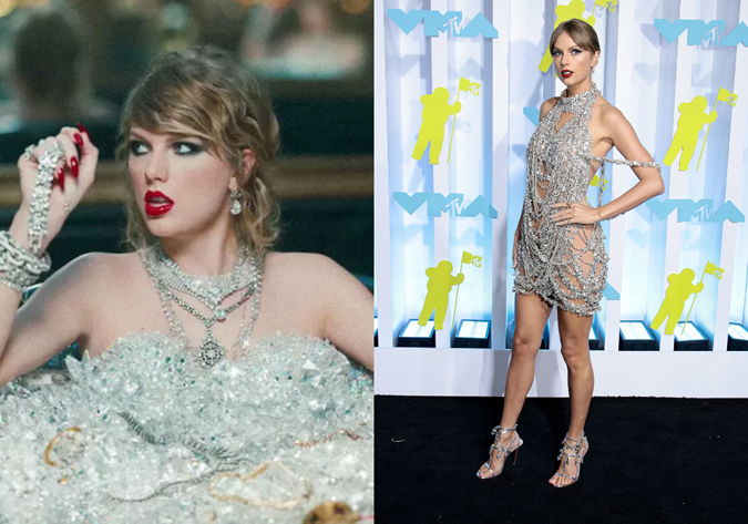 So we were quick to notice the similarities between her bejewelled VMAs dress and her outfit in the “Look What You Made Me Do” music video. Fans are already speculating that Swift is hinting the re-release of her 2017 album ‘Reputation’ and that “Taylor’s Version” may be coming sooner than we thought.
