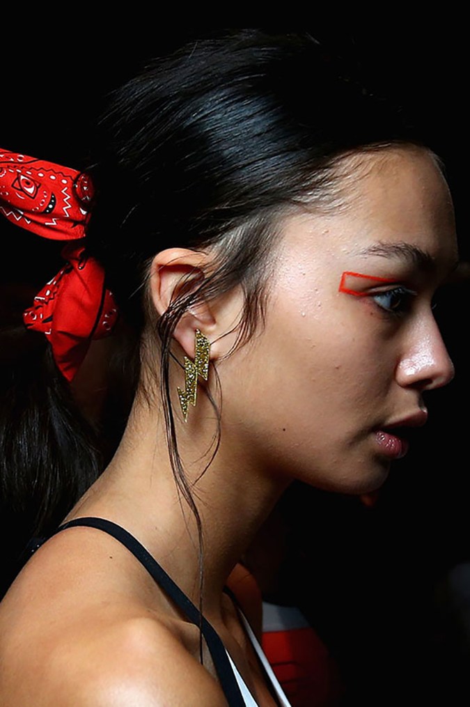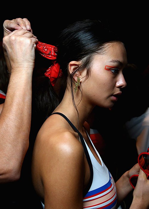 Ponytails were kept low and as close to the nape of the neck as possible this season, with the texture of it being shiny (but not wet) to mimic healthy-looking hair. Soft accessories were also hot on the runway this year, with the models at P.E. Nation sporting a bandana around their hair elastic, or even a piece of coloured hair at Karla Spetic. Interestingly, the girls at Misha Collection had pieces of distressed velvet wrapped around their ponytail, “so it’s still got that luxe sheen to it, but it’s also a bit rough, streaky and grungy”, says Dale Delaporte, lead artist for Goldwell.