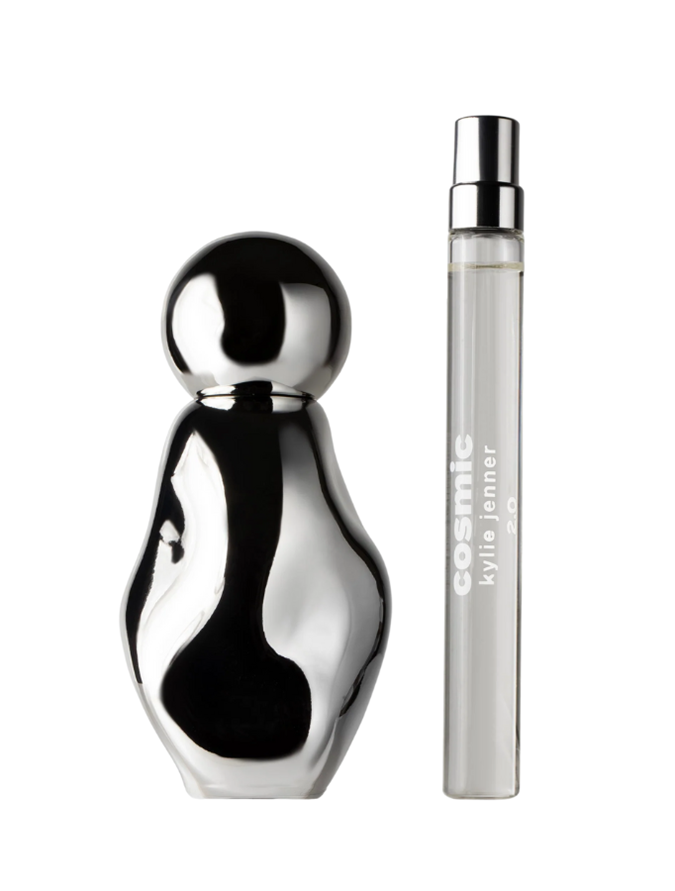 "Embody the essence of dawn with the second fragrance in the cosmic universe. Cosmic kylie jenner 2.0 — the floral amber sister to the original cosmic — envelops you in fresh, bright, and sweet notes grounded in a warm amber base, " says the Kylie Cosmetics website. "This captivating fragrance is housed in a chrome edition of our original sculptural bottle and is formed to fit perfectly in the palm of your hand."