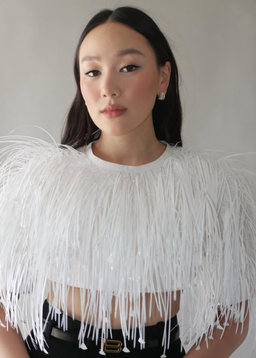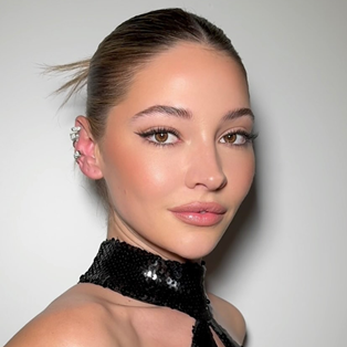 Then she used Merit Solo Shadows in ‘Studio’, ‘Surrealism’, and ‘Brun’ ($42 from Merit Beauty) to create a modern take on a '60s cat eye, blending everything with the Merit Brush No. 2 ($32 from Merit Beauty). And enhanced Ha's natural lip colour with the Merit Signature Lip Liner in 'Sportif' ($38 from Merit Beauty) and the Merit Signature Lip Blush in ‘Andie’ ($44 from Merit Beauty).