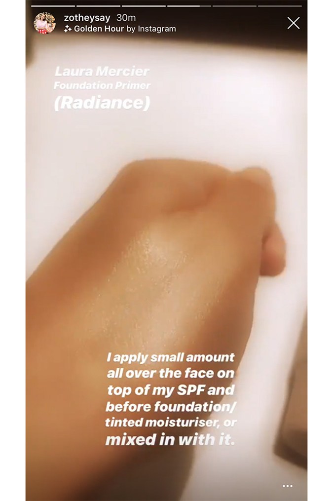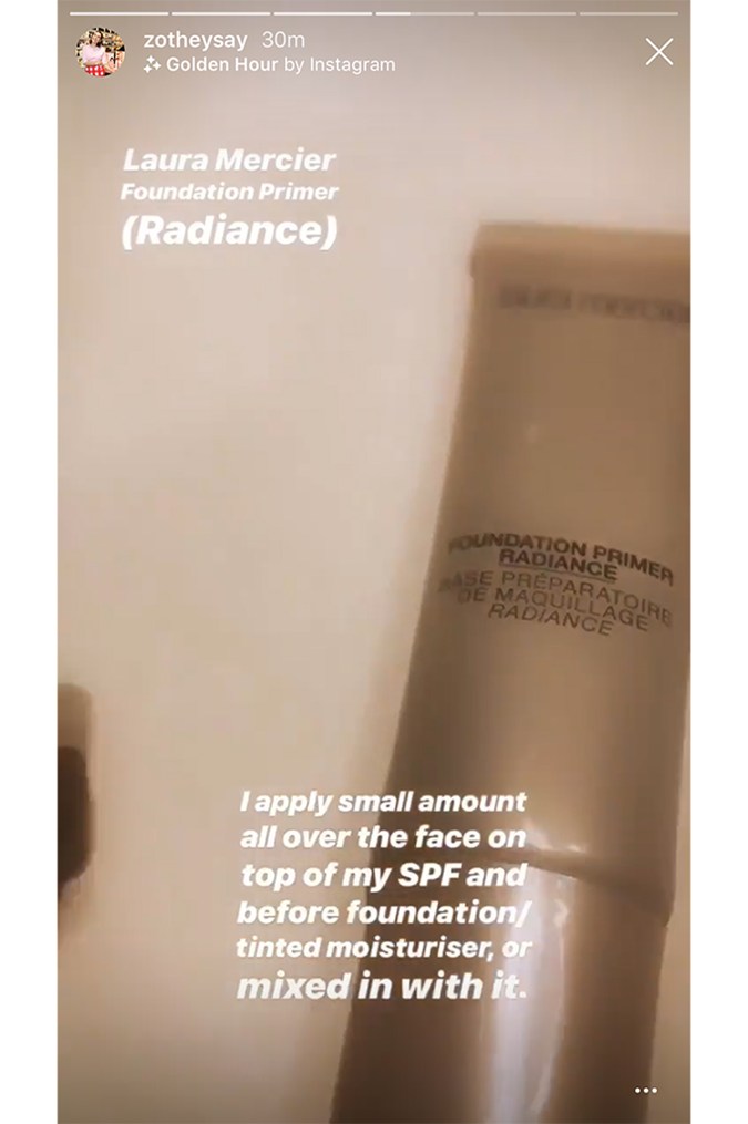 First up is Laura Mercier’s Foundation Primer Radiance, which she uses to get an all-over subtle sheen: “I apply a small amount all over the face on top of my SPF and before foundation/tinted moisturiser or mixed in with it.”