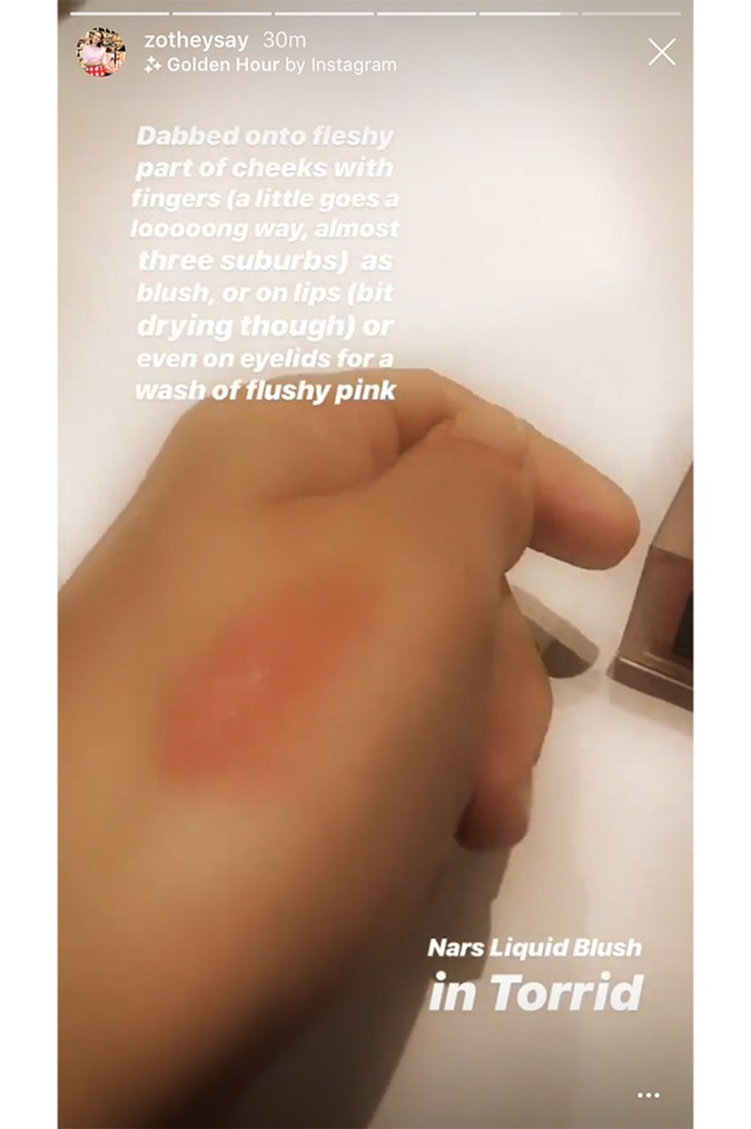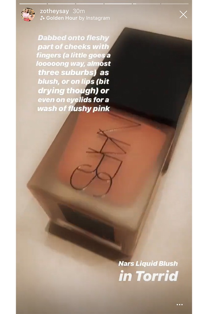 Next, Zoe opts for NARS Liquid Blush in the shade Torrid – a great multitasking product that can be used on cheeks and eyes, but be careful not to be too heavy-handed with this one, as Zoe explains, “Dabbed onto fleshy part of cheeks with fingers (a little goes a looooong way, almost three suburbs) as blush, or on lips (bit drying though) or even on eyelids for a wash of flushy pink”.